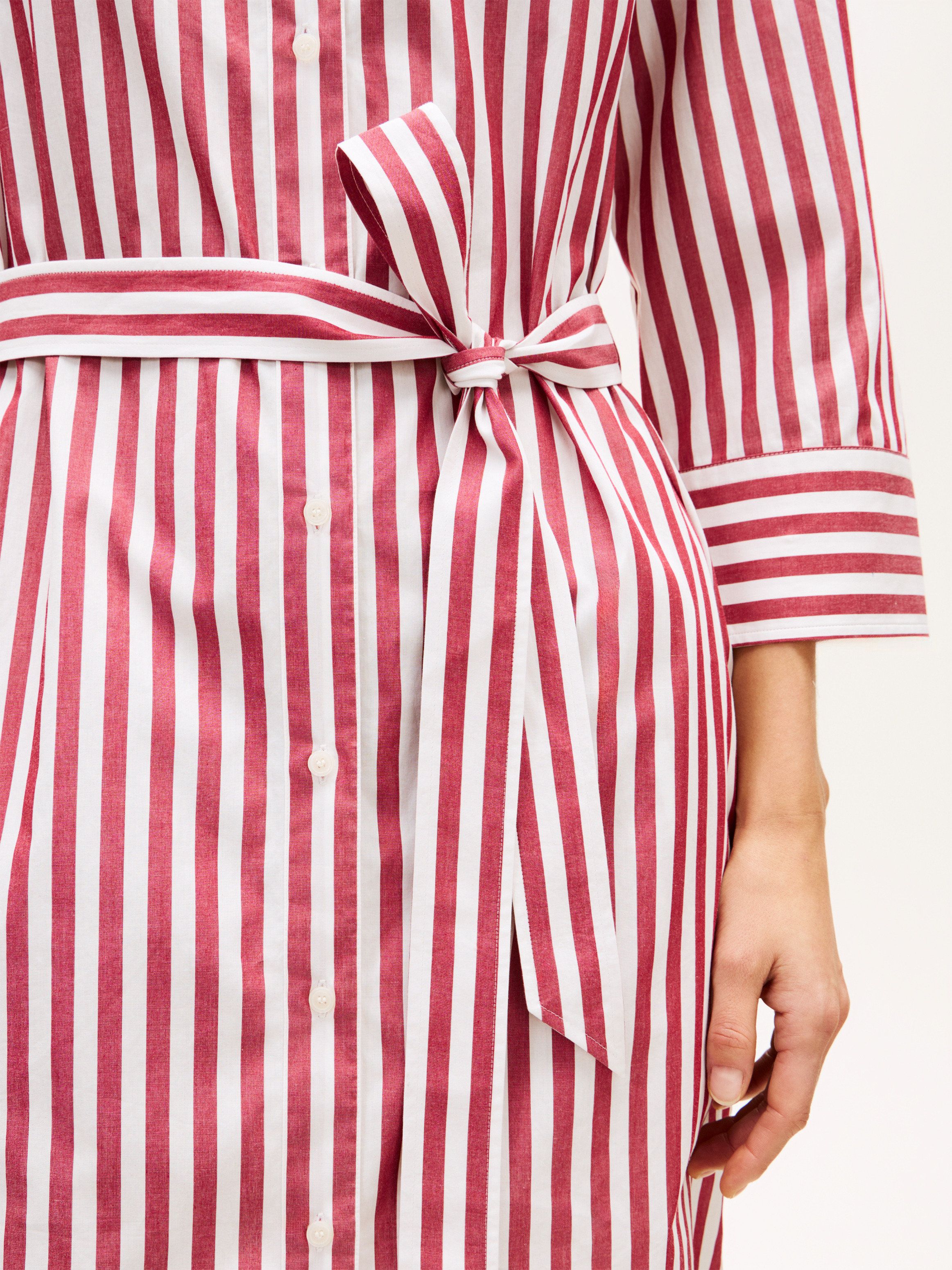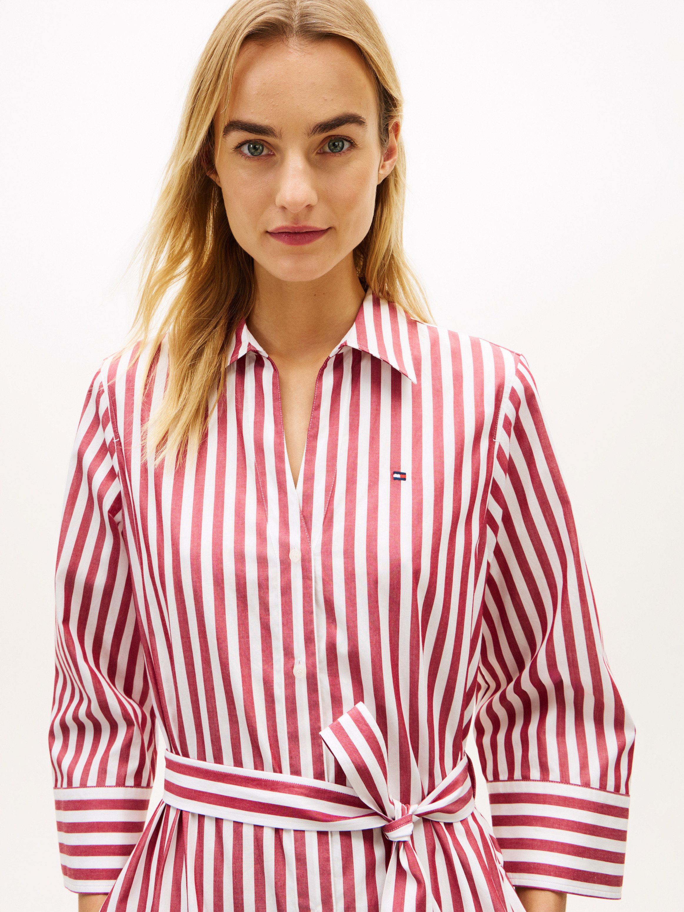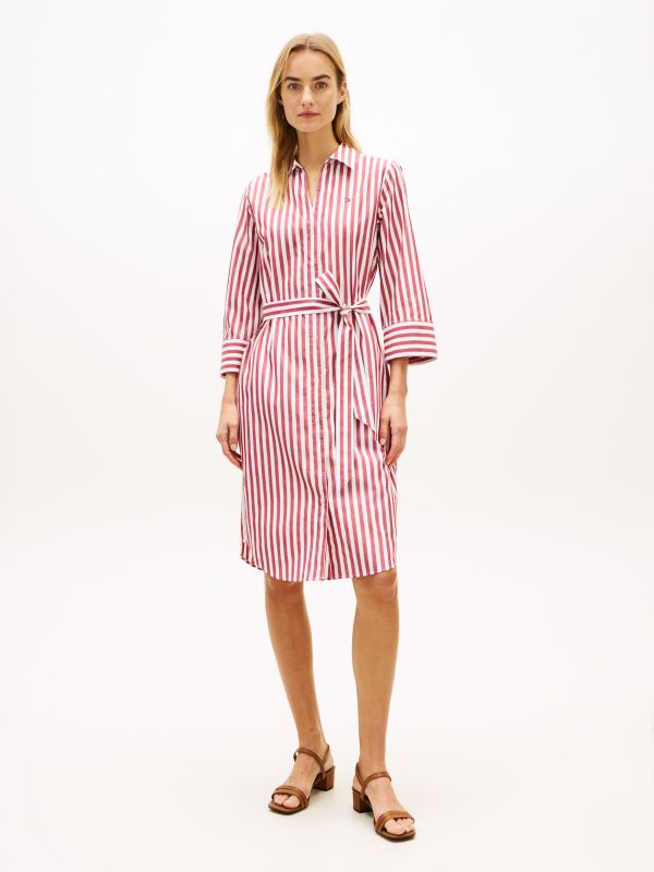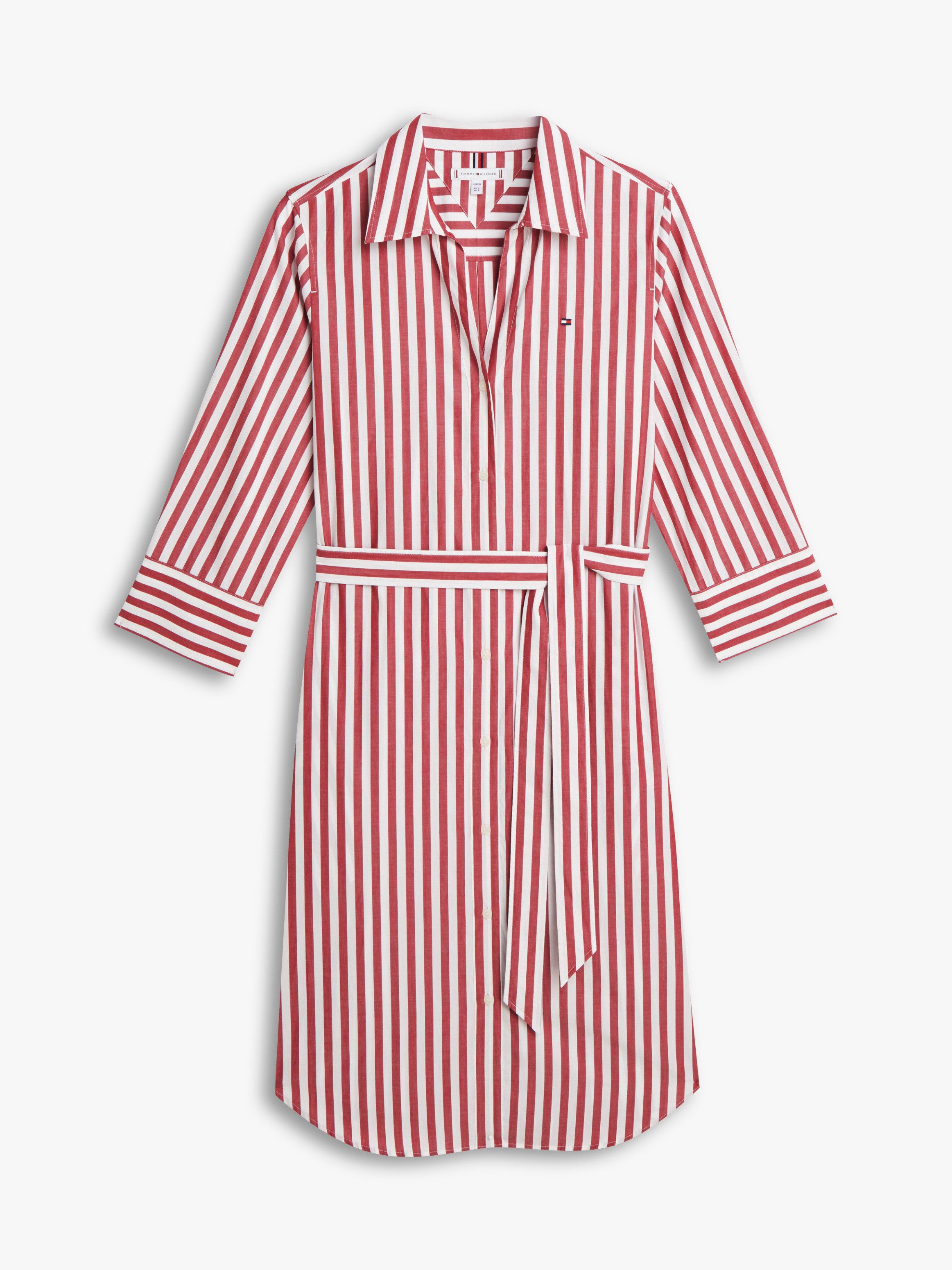 • Pure cotton poplin • Semi-spread collar • V-neck • Pleats on back • Self-tie belt • One-button cuffs • Rounded hem • Two side slip pockets • Signature tape inside neckline and on side • Tommy Hilfiger branding • Tommy Hilfiger flag embroidery on chest