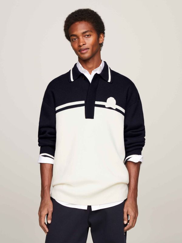 • Cotton cashmere blend • Bi-colour design • Tipped polo collar and cuffs • Contrast stitching on nape • Concealed button placket • THC crest appliqué on chest • TH Collection branding