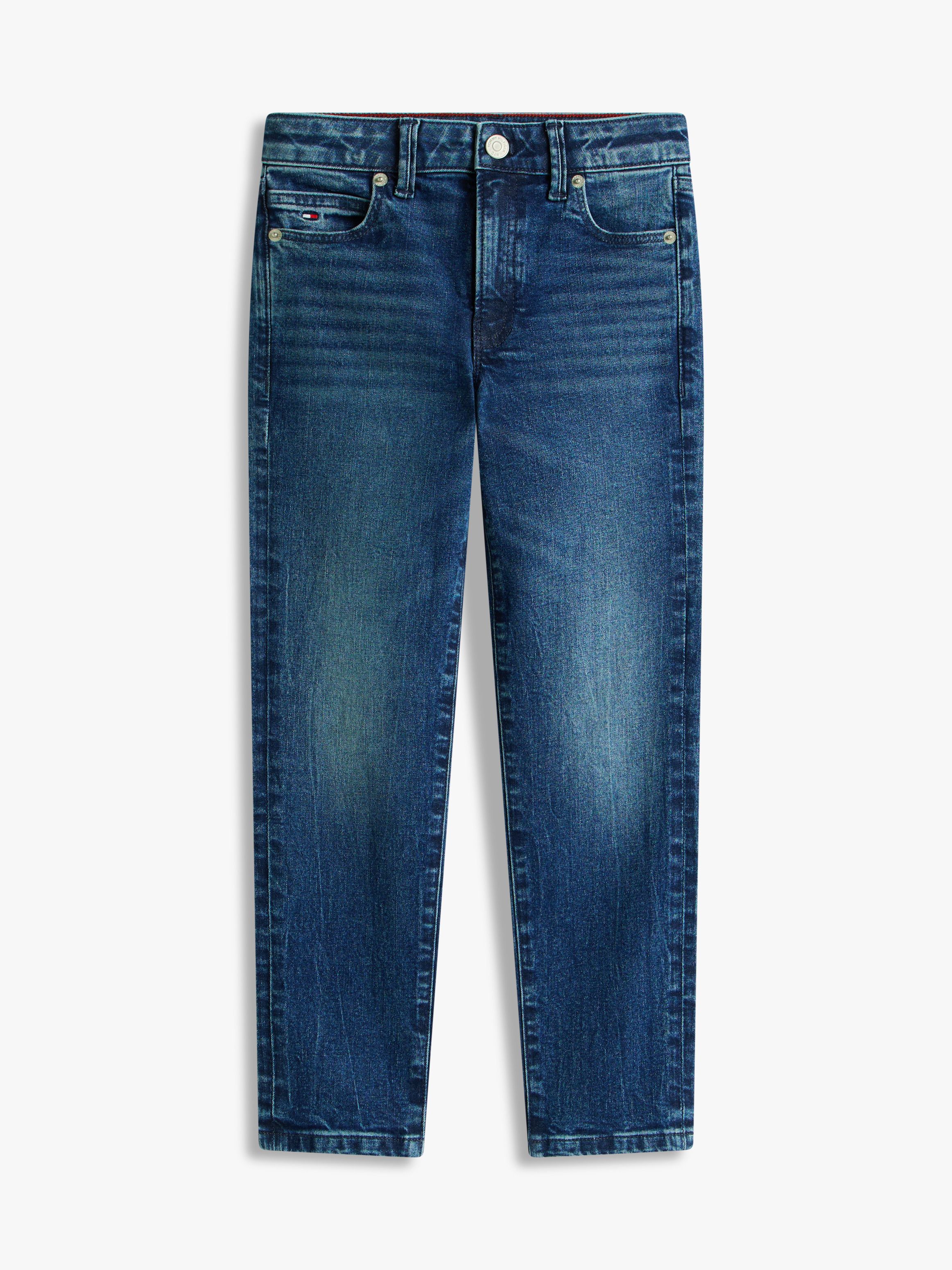 • Stretch cotton denim • Whiskering and fading on front and back • Zip with button closure • Five-pocket styling • Tommy Hilfiger branding • Tommy Hilfiger flag embroidery on coin and back pockets