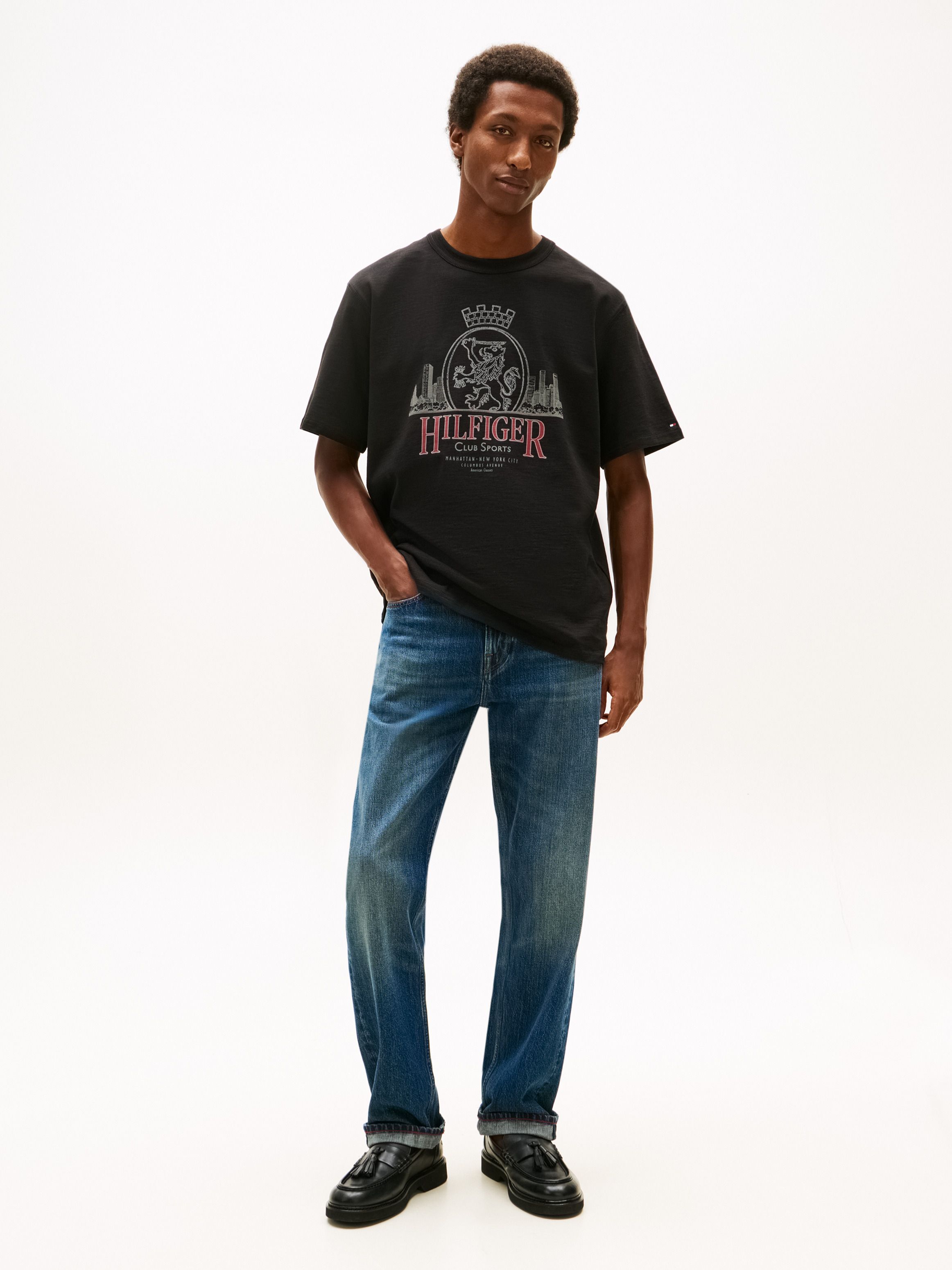 • Pure slub cotton jersey • Crew neck • Signature tape inside neckline • Tommy Hilfiger New York crest graphic on front • Tommy Hilfiger branding • Tommy Hilfiger flag embroidery on sleeve