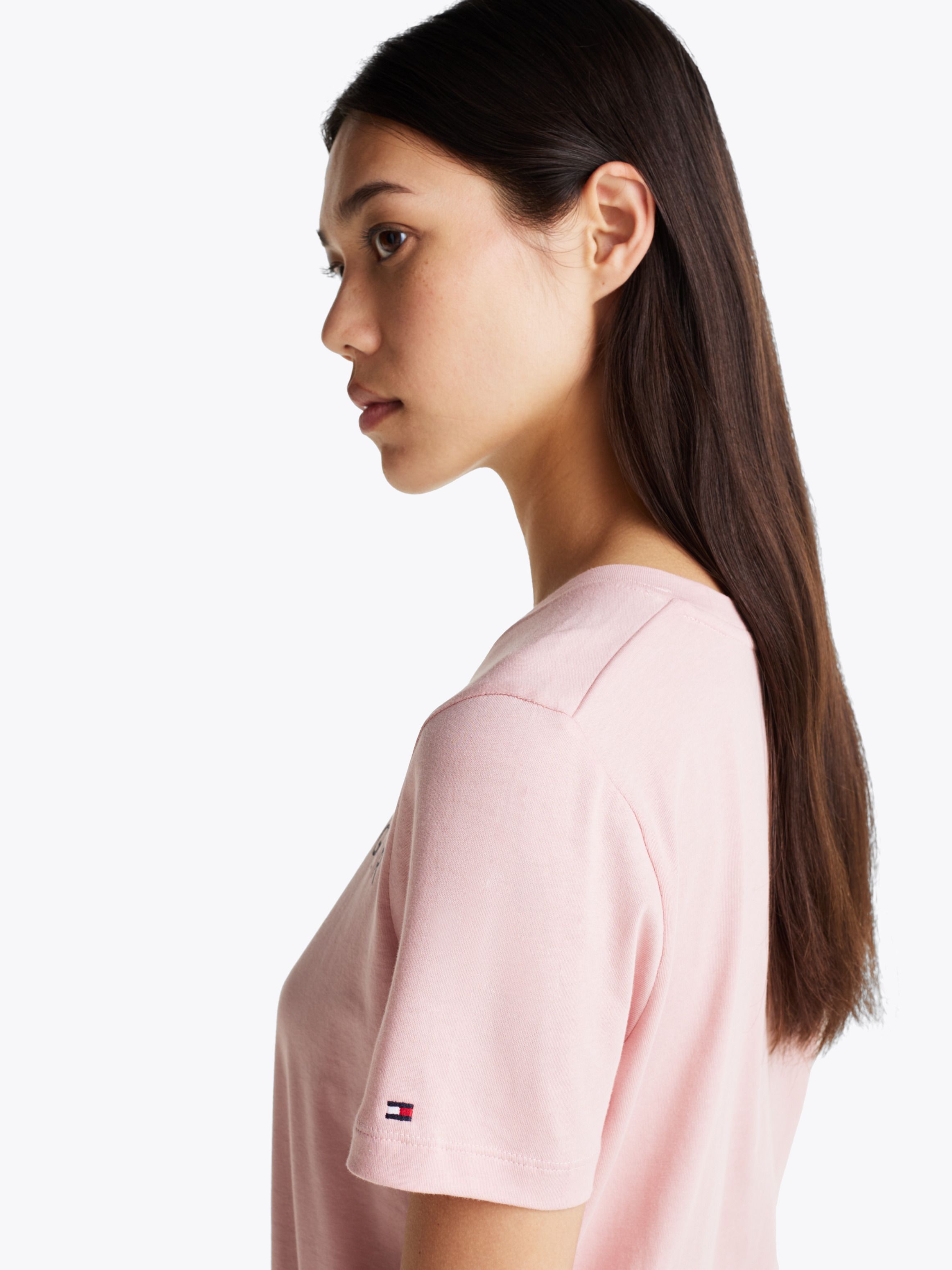 Elevate your casual looks with this crew-neck tee crafted from pure cotton and enhanced with the front Tommy Hilfiger logo.