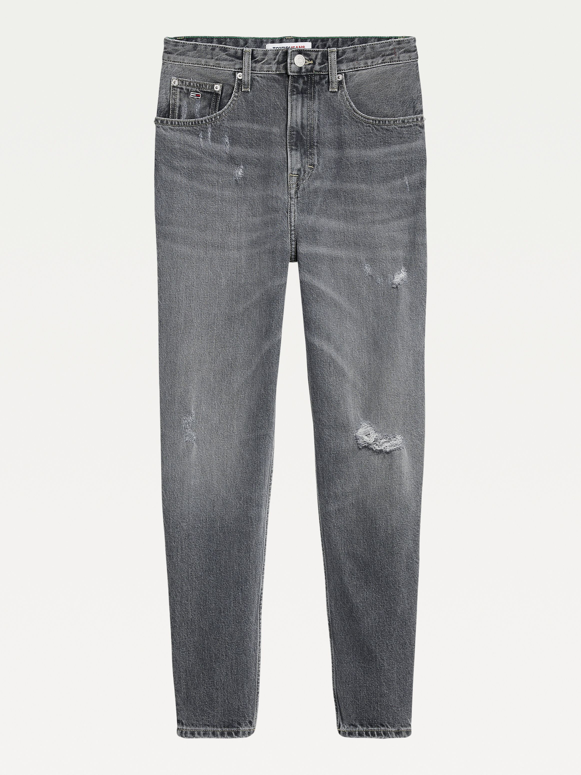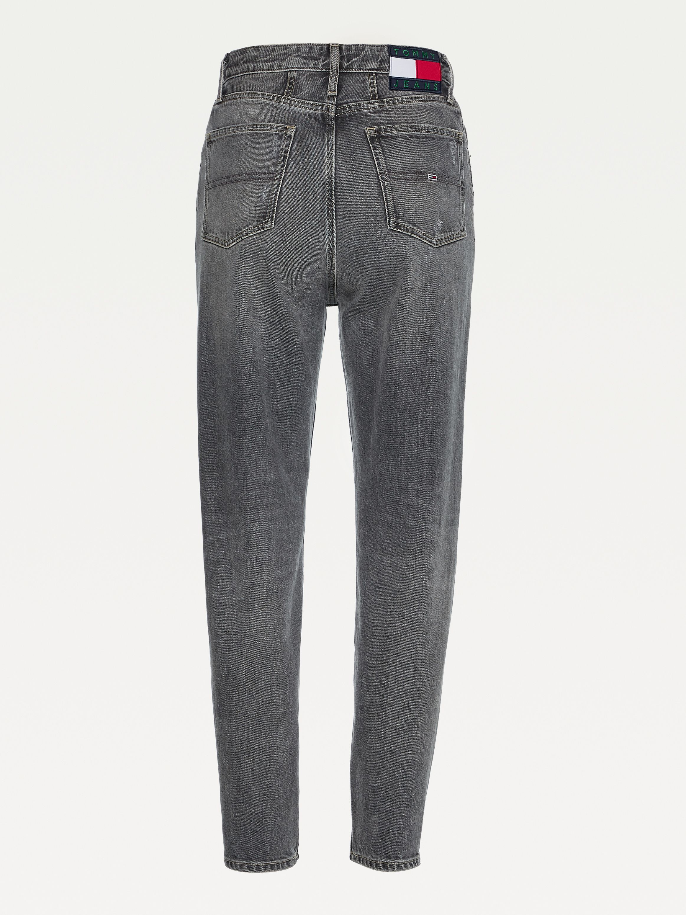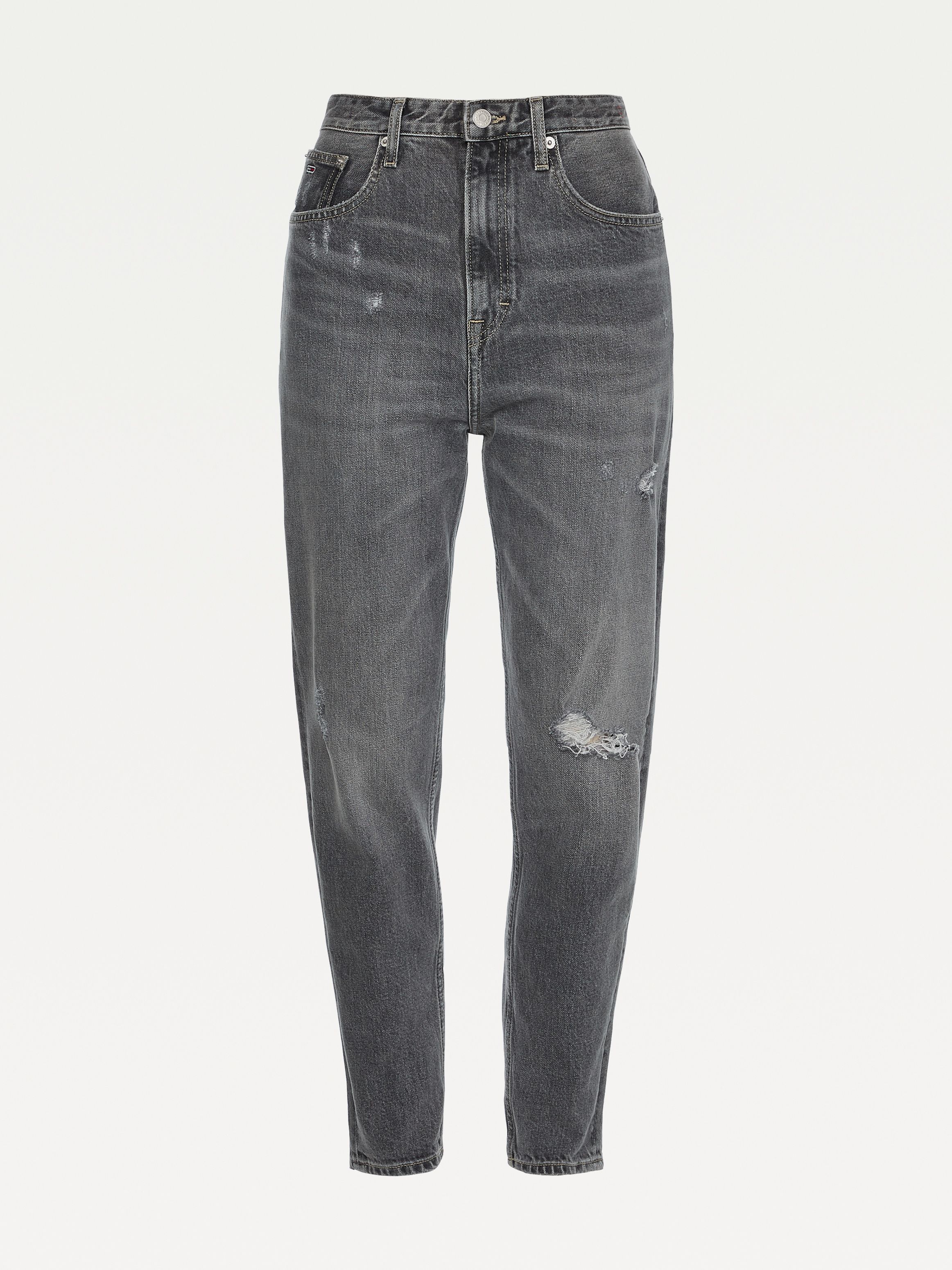 All-over fading and distressed touches give a relaxed look to these mom jeans with an elegant ultra high rise waist.