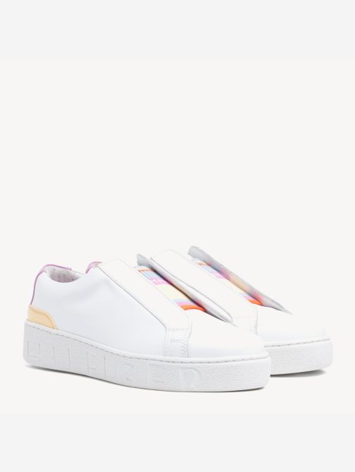• Leather upper • Leather and cotton lining • Leather insock • Natural rubber outsole • Elasticated multicolour panel on tongue • Contrast panels at heel • Abstract design embossed on outsole • Tommy Hilfiger logo embossed along outsole • Tommy Hilfiger logo embossed on outsole • Tommy Hilfiger logo on insock • Tommy Hilfiger flag plaque on heel