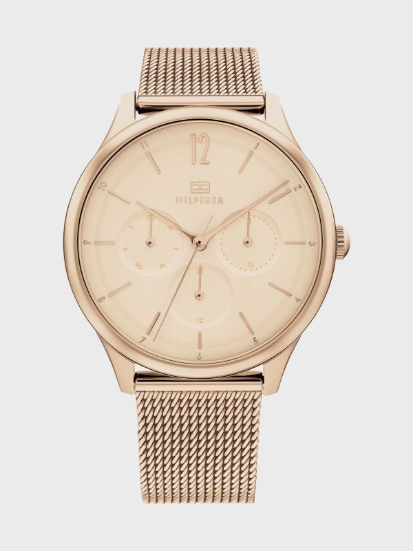 Blend sophistication and information with this carnation gold-plated watch featuring mesh strap and sub-counters to keep you up to date.