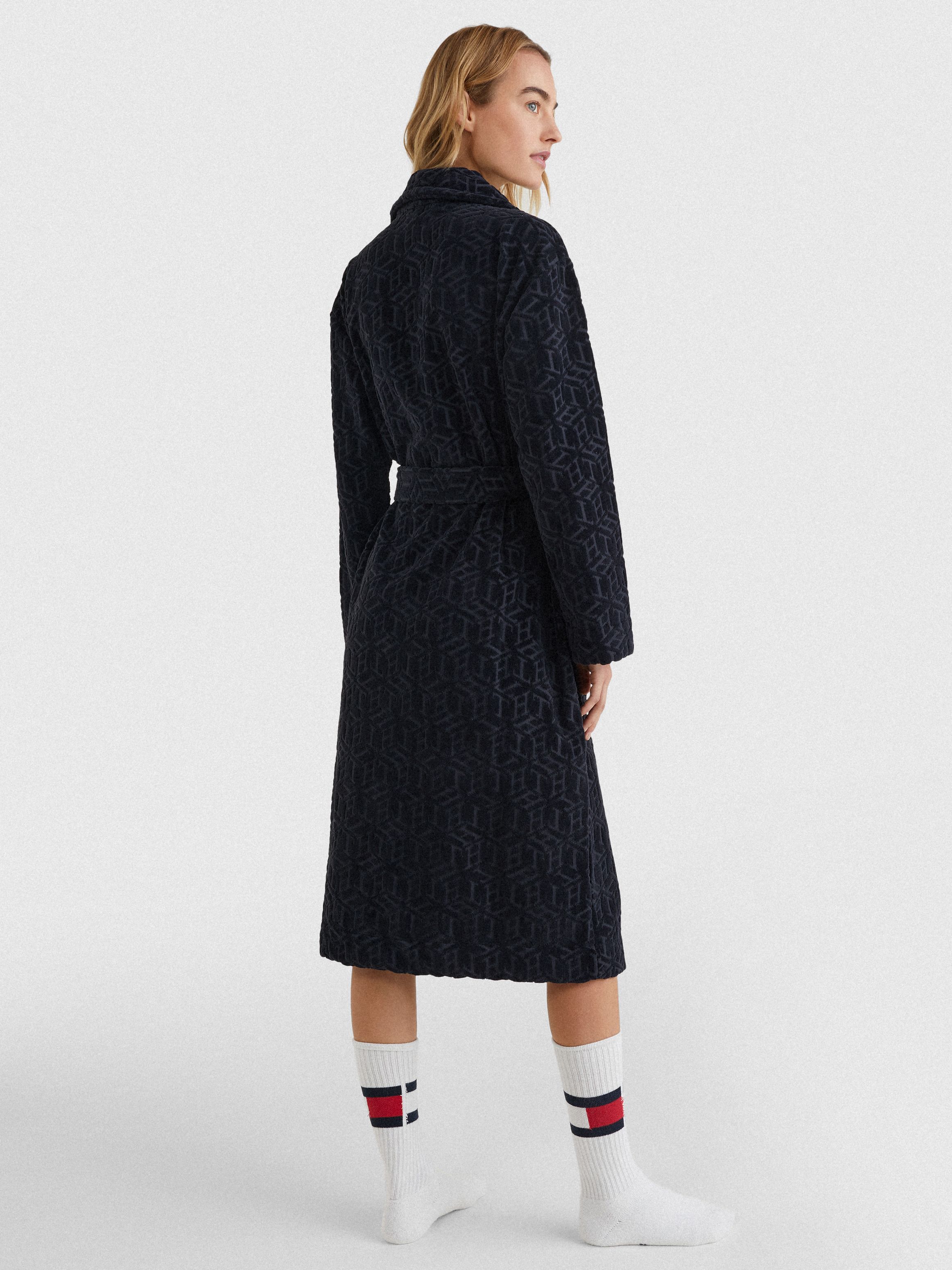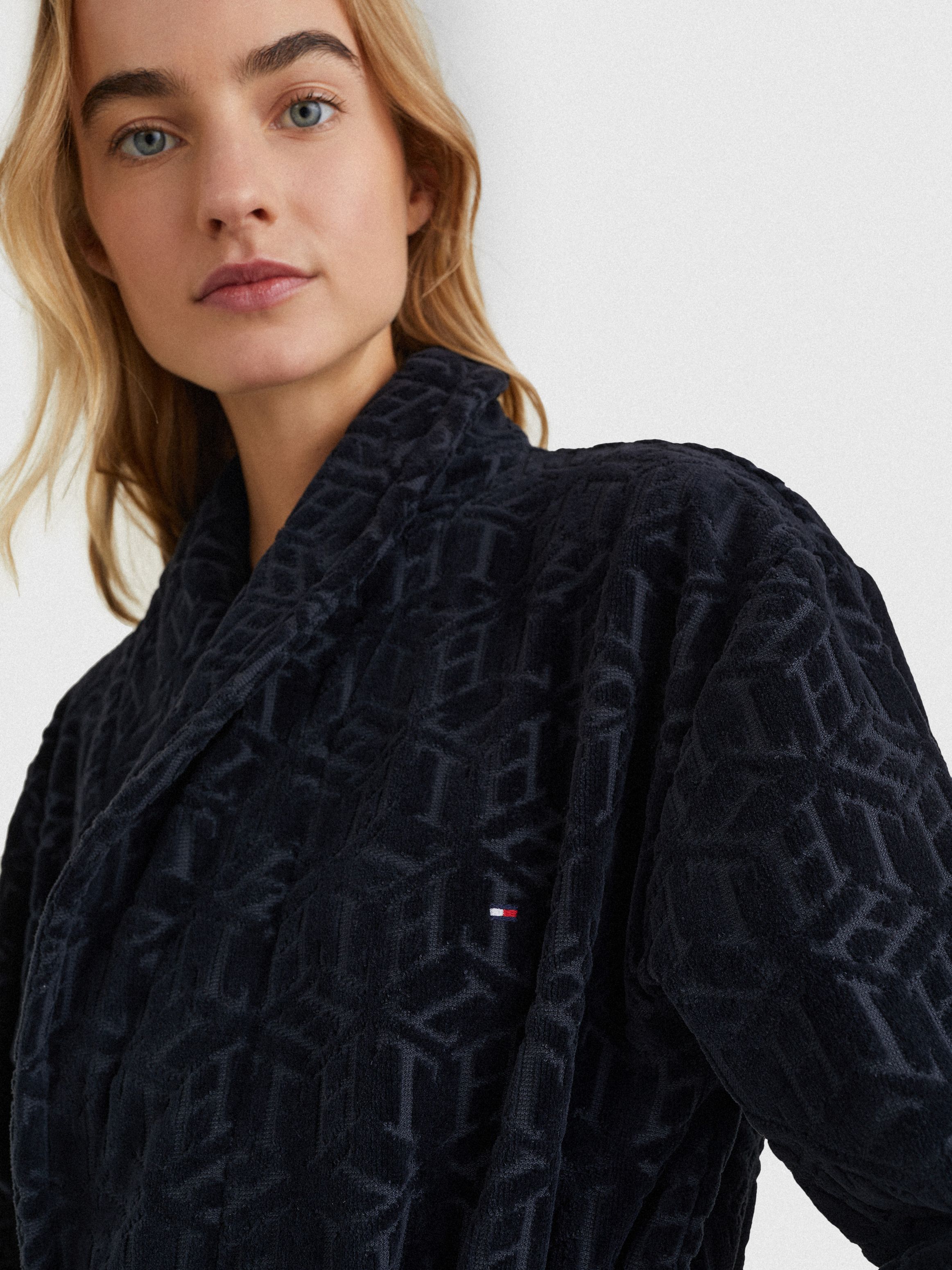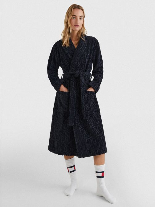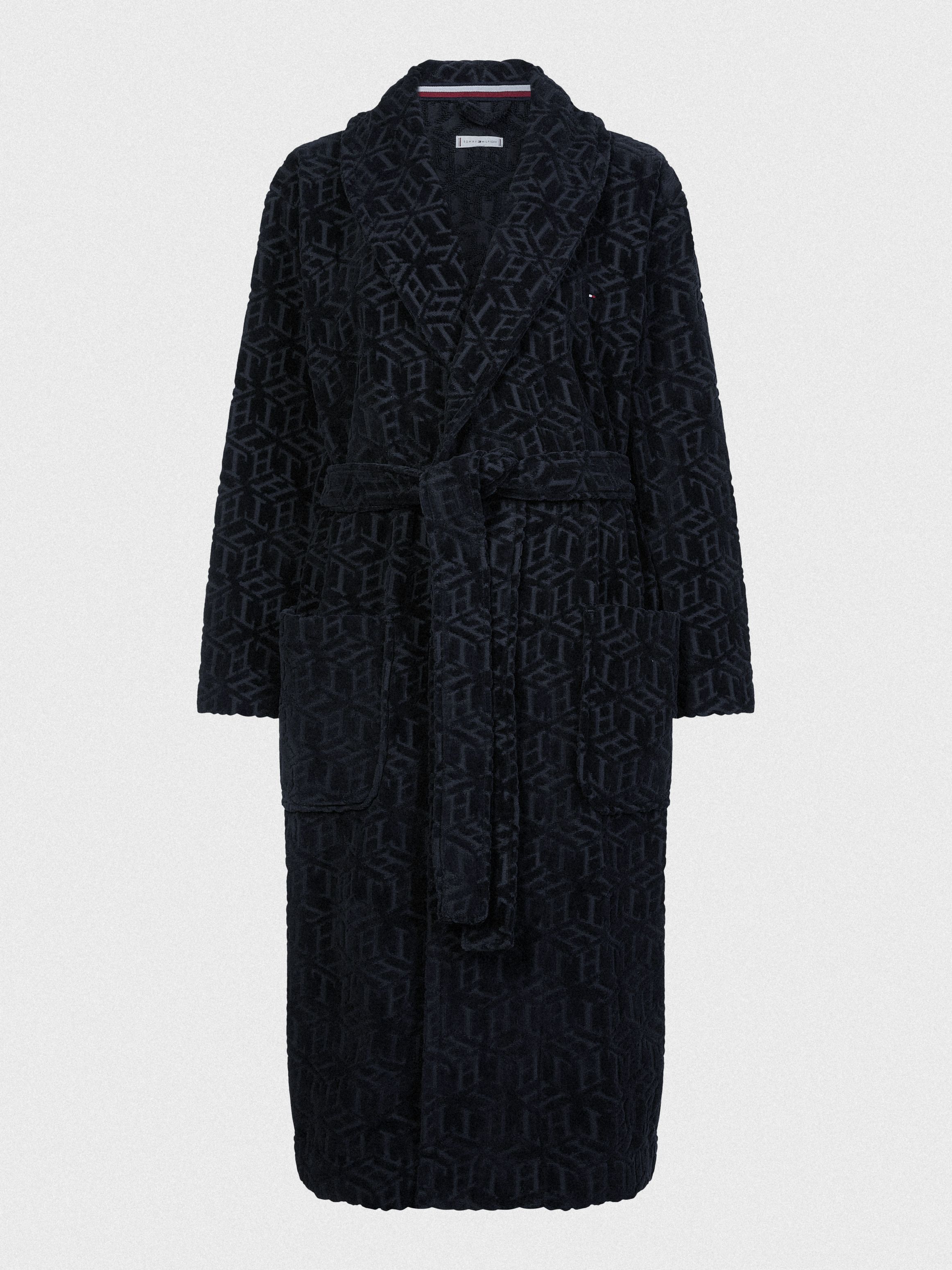 • Pure organic cotton towelling • All-over stripe and Tommy Hilfiger logo jacquard • Shawl collar • Self-tie belt at waist • Two front patch pockets • Tommy Hilfiger branding • Tommy Hilfiger flag embroidery on chest