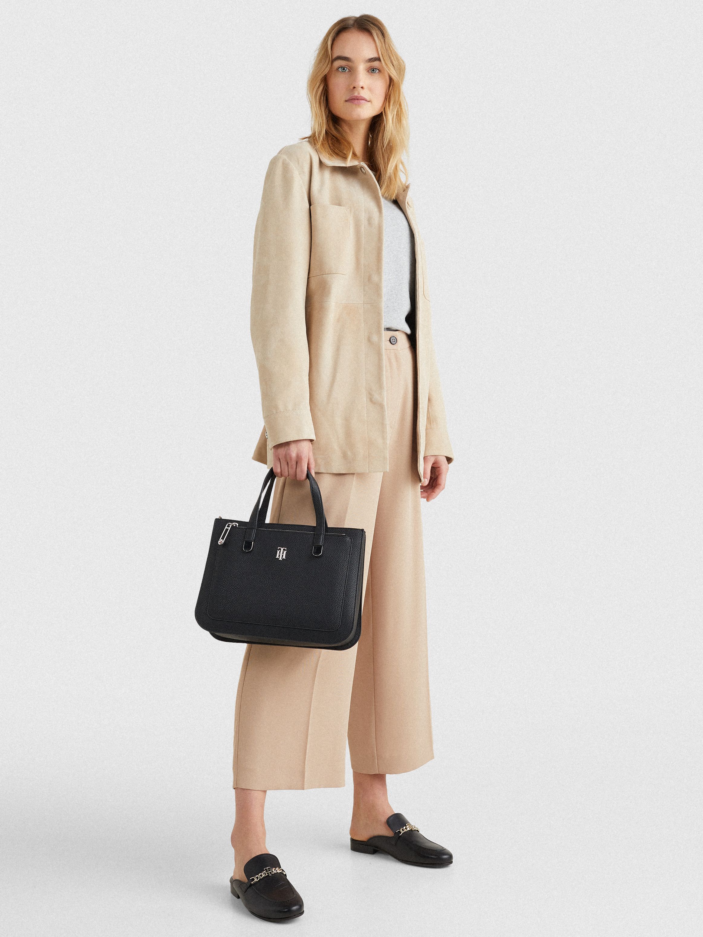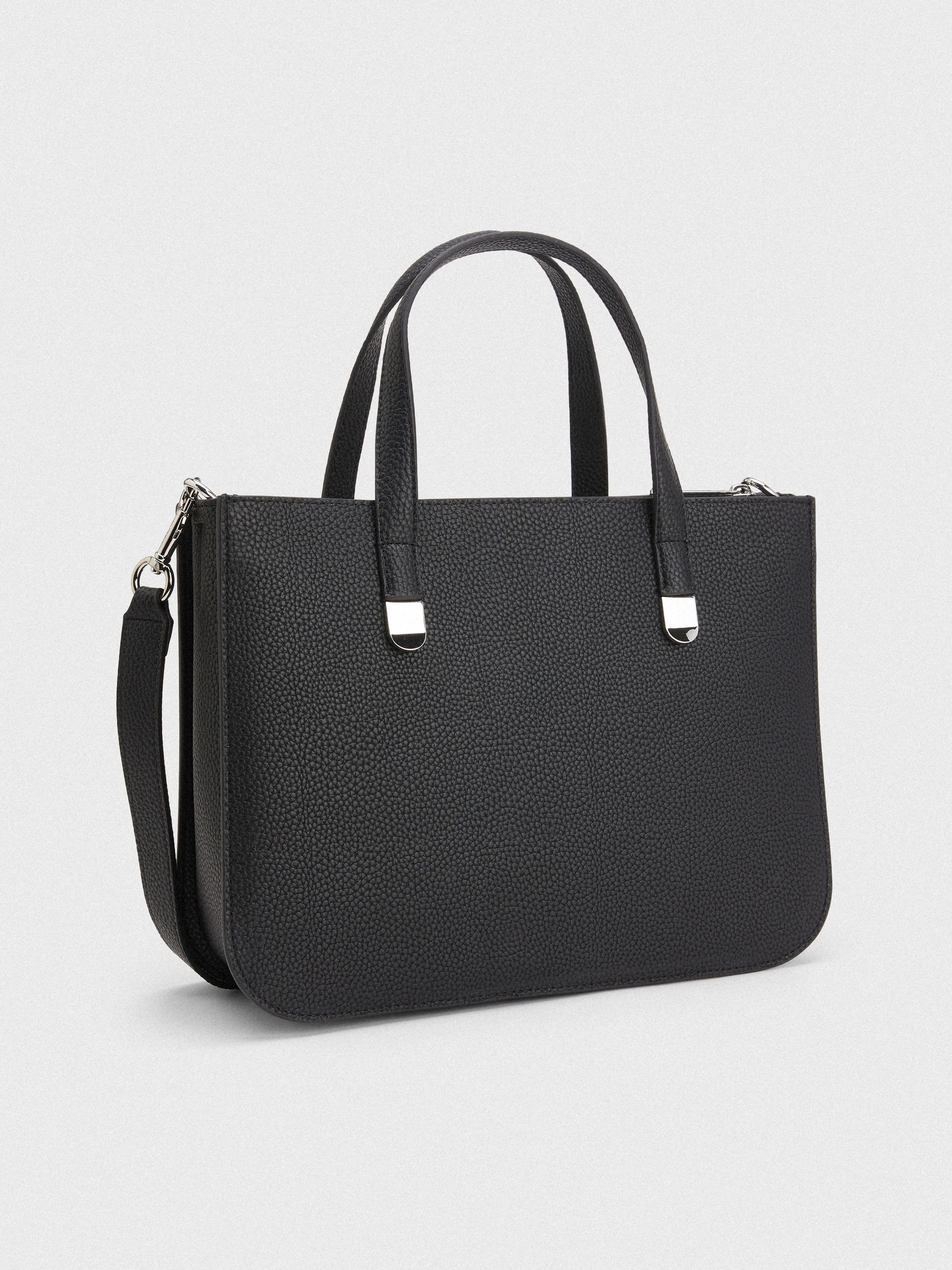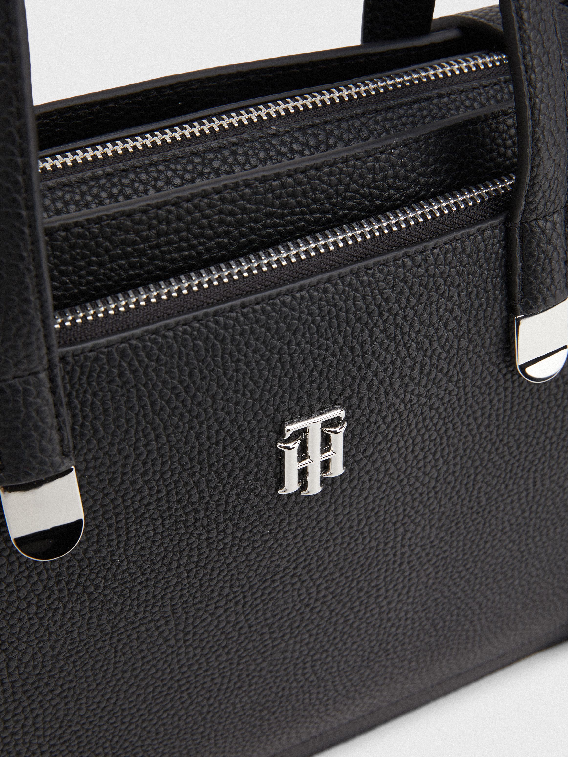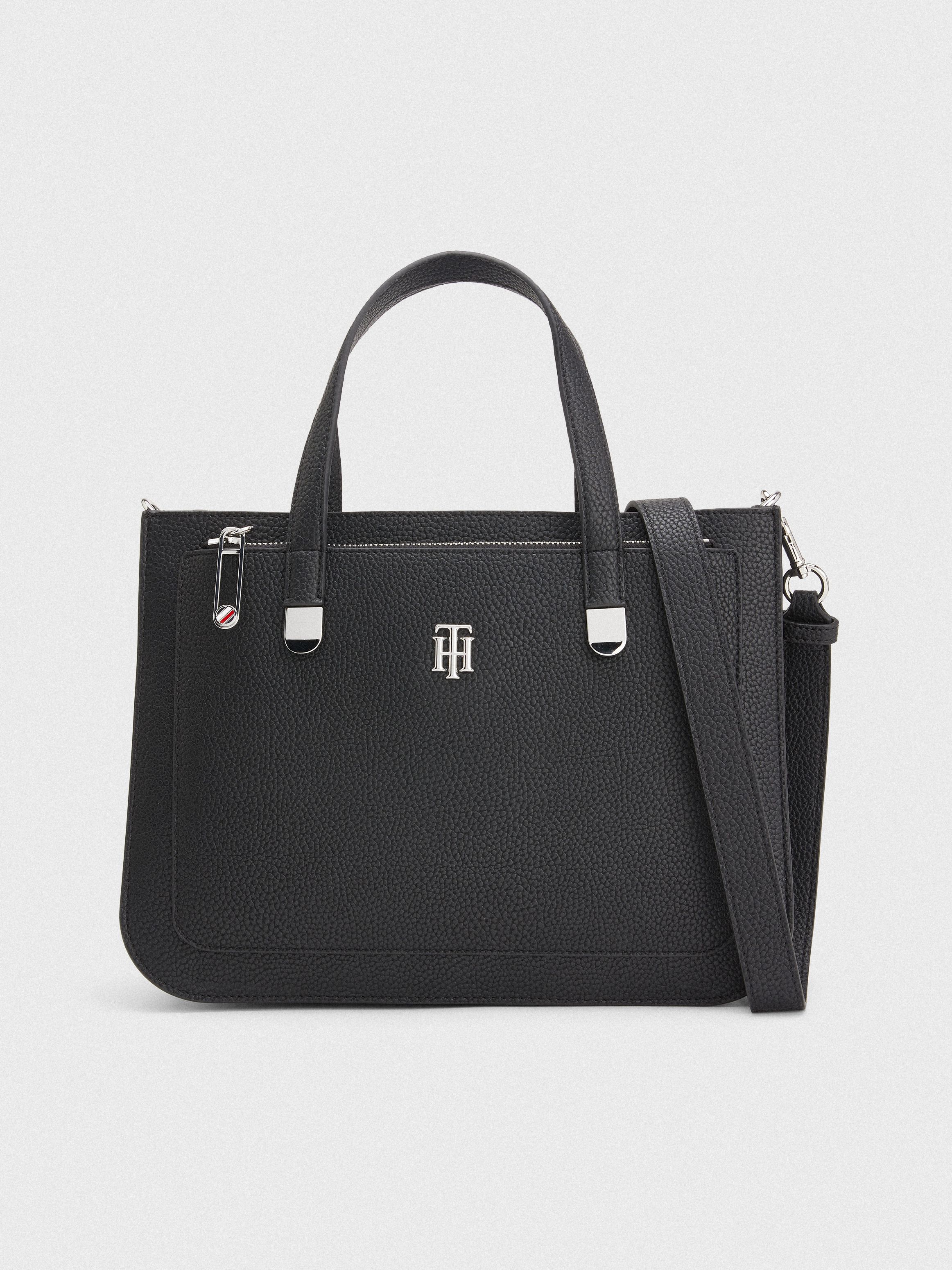 • Pebble-grain finish • Zip closure • Two top handles • Adjustable, removable shoulder strap • One main compartment • One front zipped pocket • One interior slip pocket • TH interlock plaque on front • Tommy Hilfiger branding
