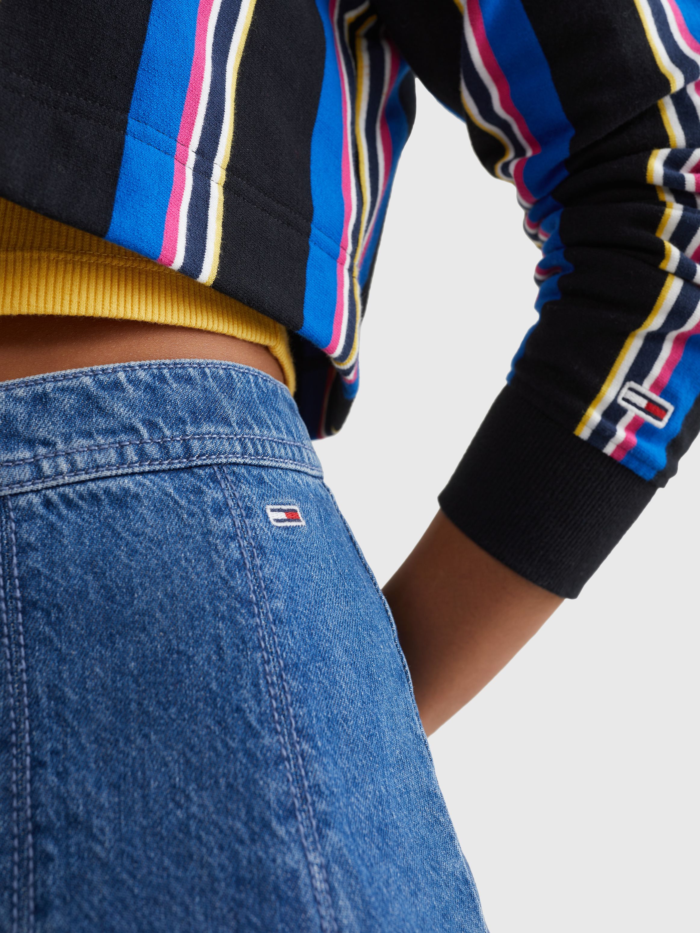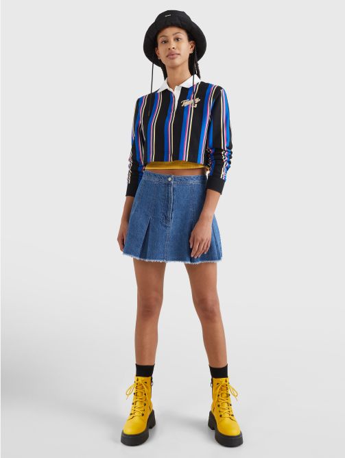 Rock a retro-inspired look in this denim mini skirt with its all-over pleating and a grungy frayed hem.