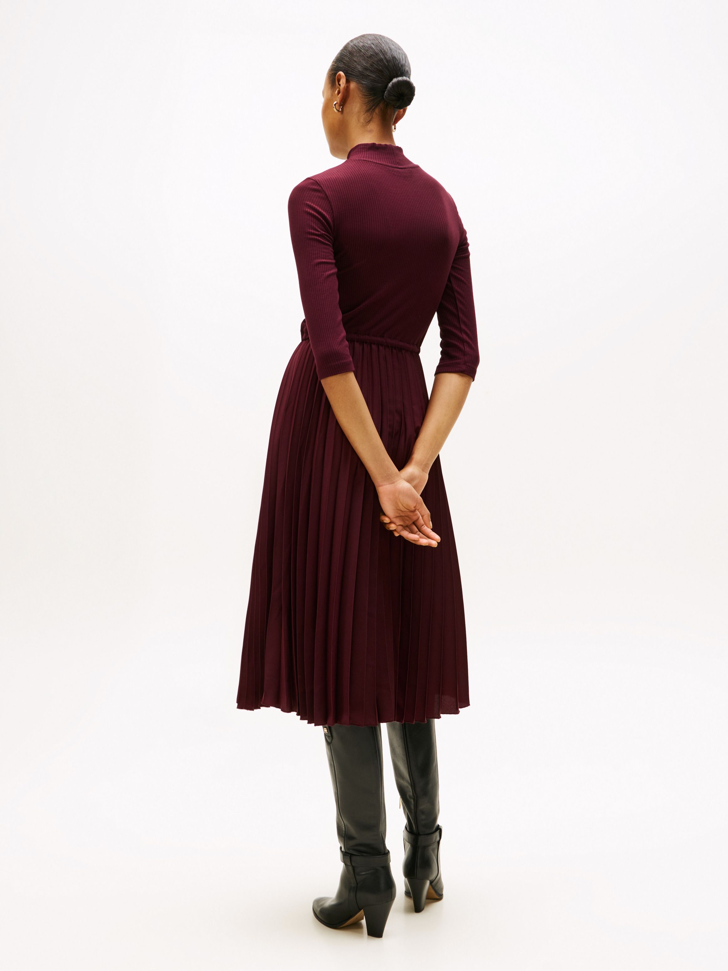 Enjoy contrasting textures in this flattering fit and flare midi dress with a slim-fit ribbed top and flowing pleated skirt.