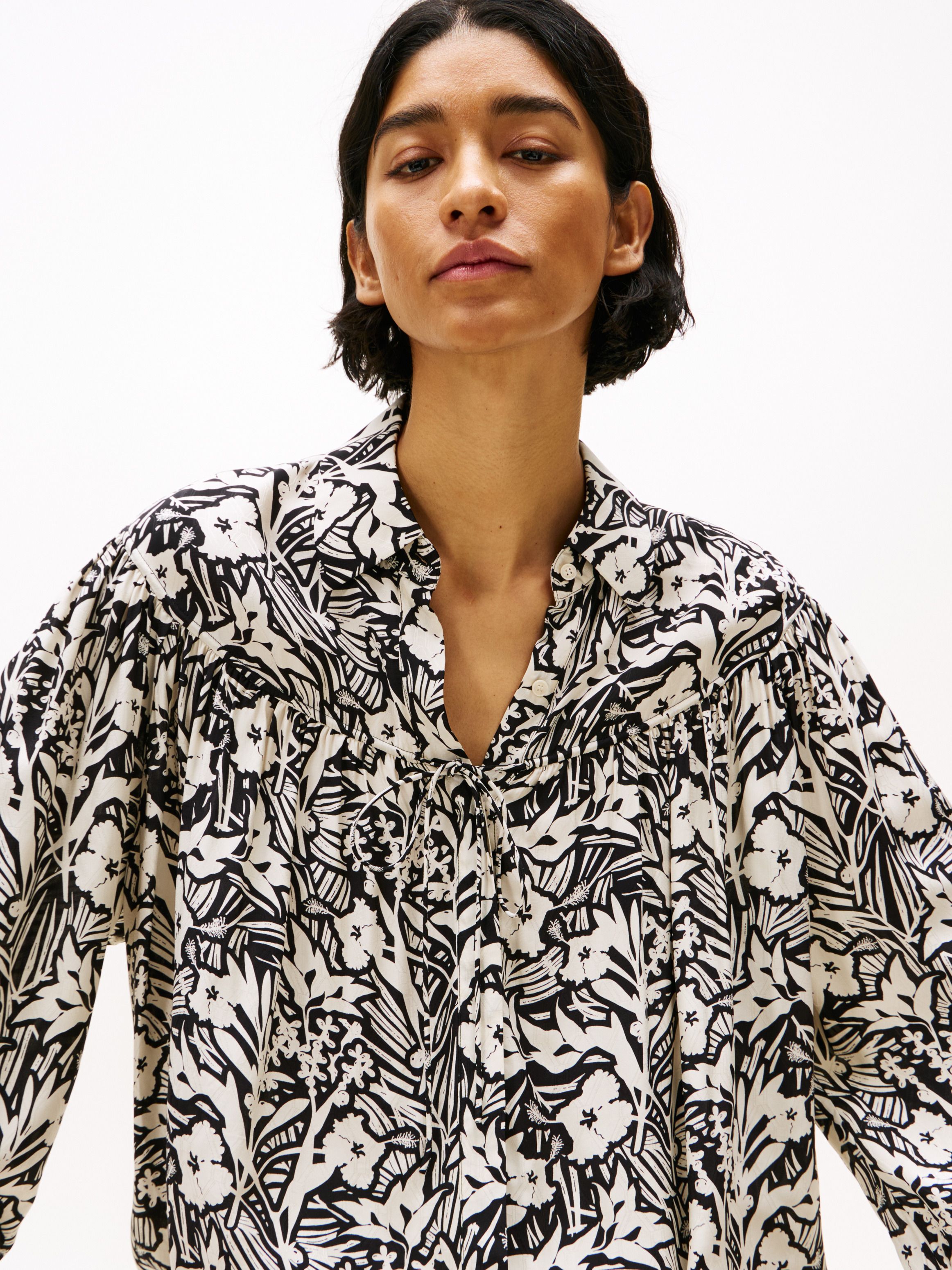 • Viscose jacquard • Adjustable tie on front • Semi-spread collar • One-button cuffs • Concealed placket • Tommy Hilfiger branding • Tommy Hilfiger metal flag on hem