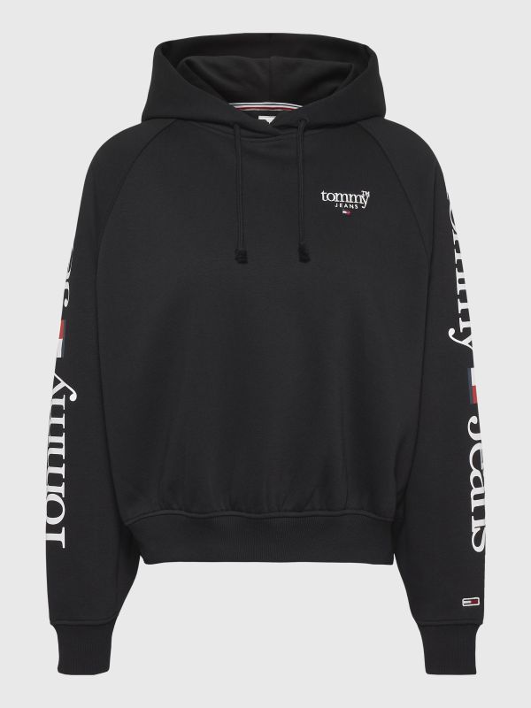 • Organic cotton blend • Drawstring hooded neck • Rib-knit cuffs and hem • Tommy serif logo on chest and sleeves • Tommy Jeans branding • Tommy Jeans flag patch at cuff