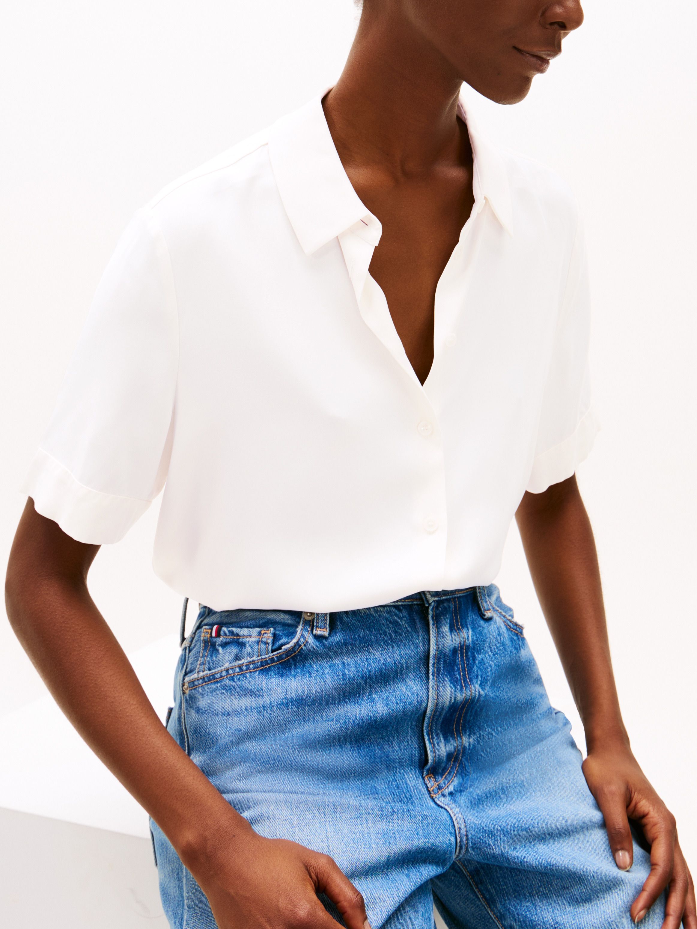 This short-sleeve shirt is made from a flowing fabric that enhances the relaxed silhouette with a feminine drape.