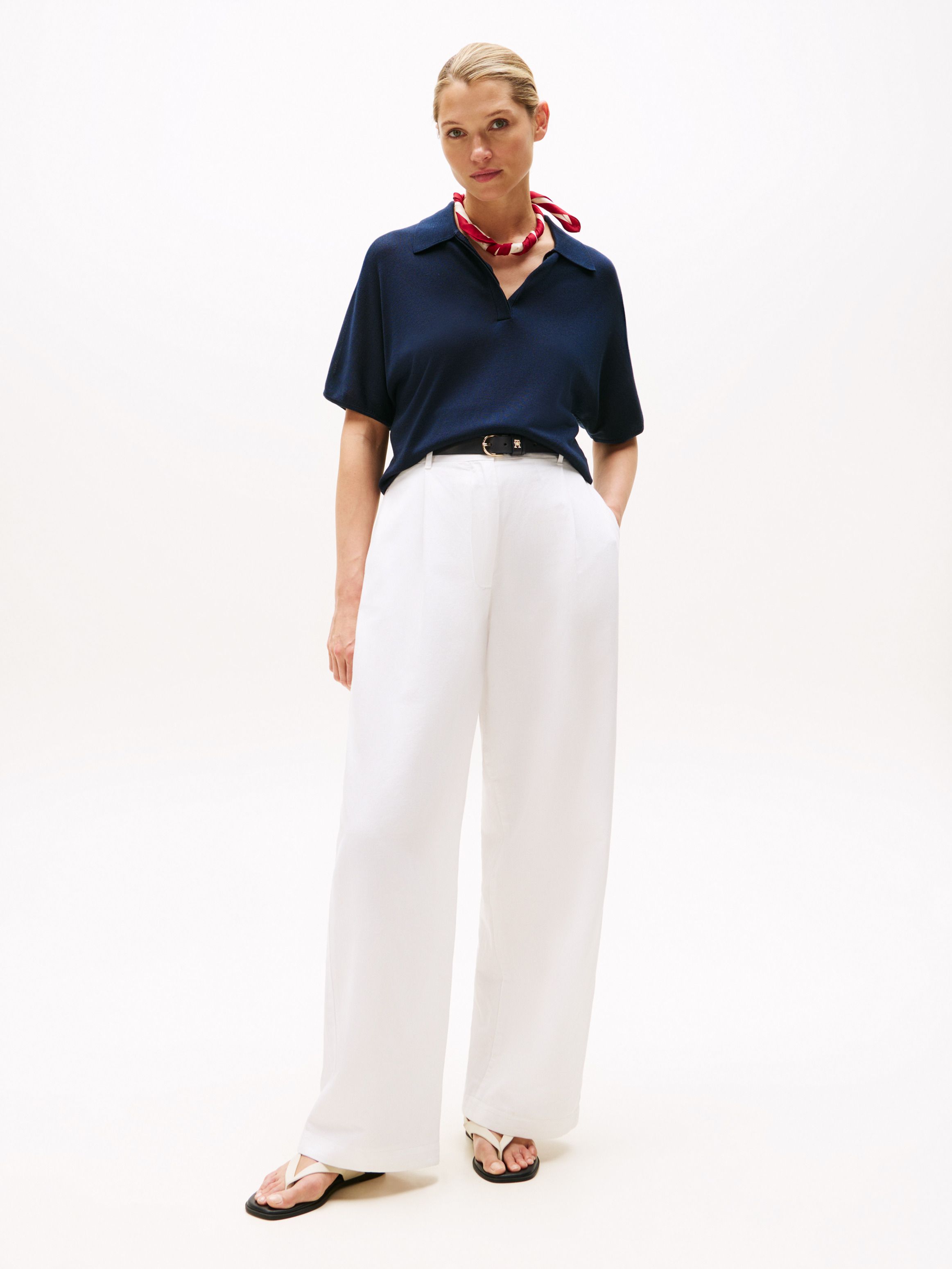This short-sleeved polo jumper with silk in the fabric and metal flag branding is a luxe piece for your day-to-evening wardrobe.