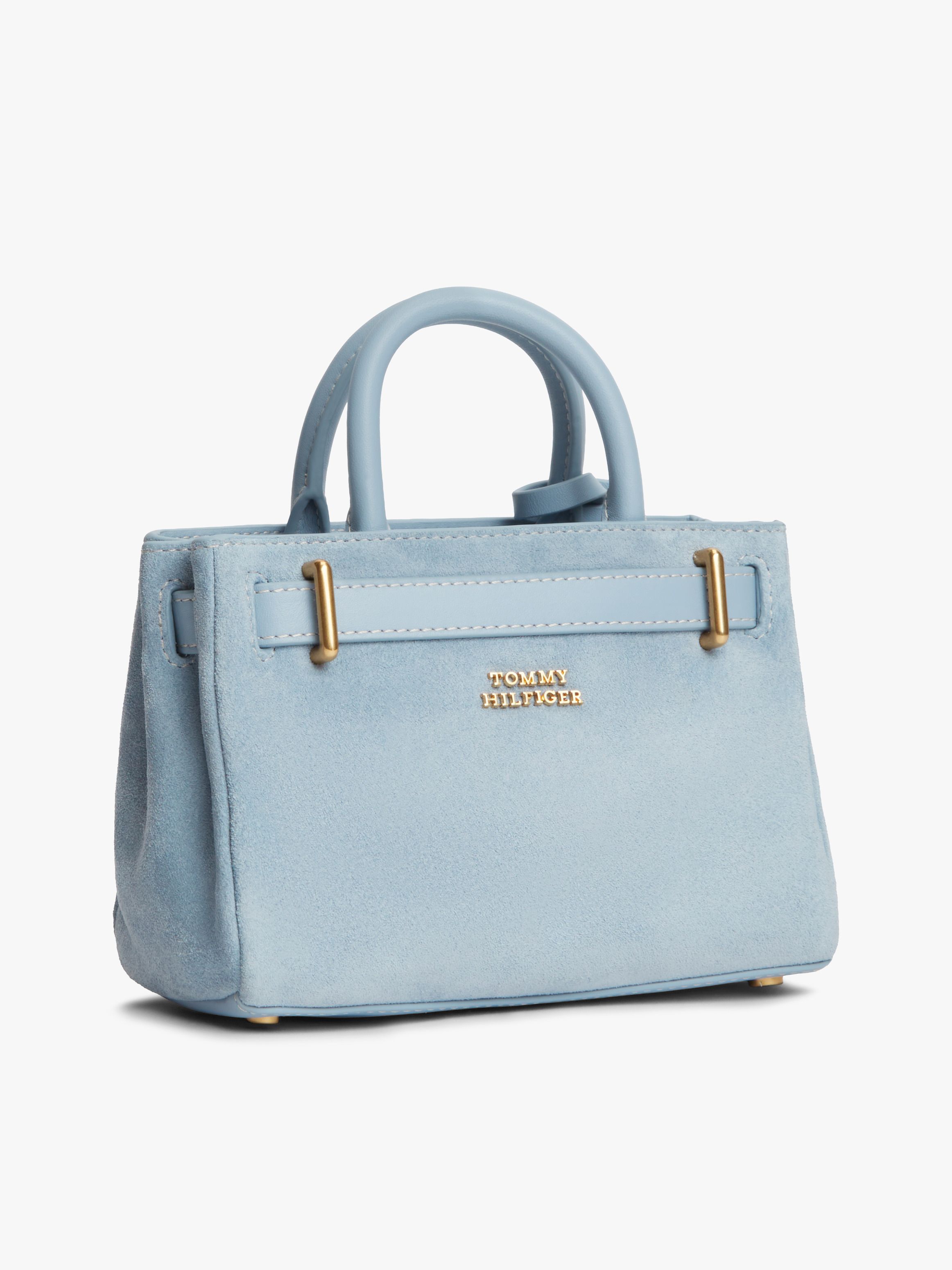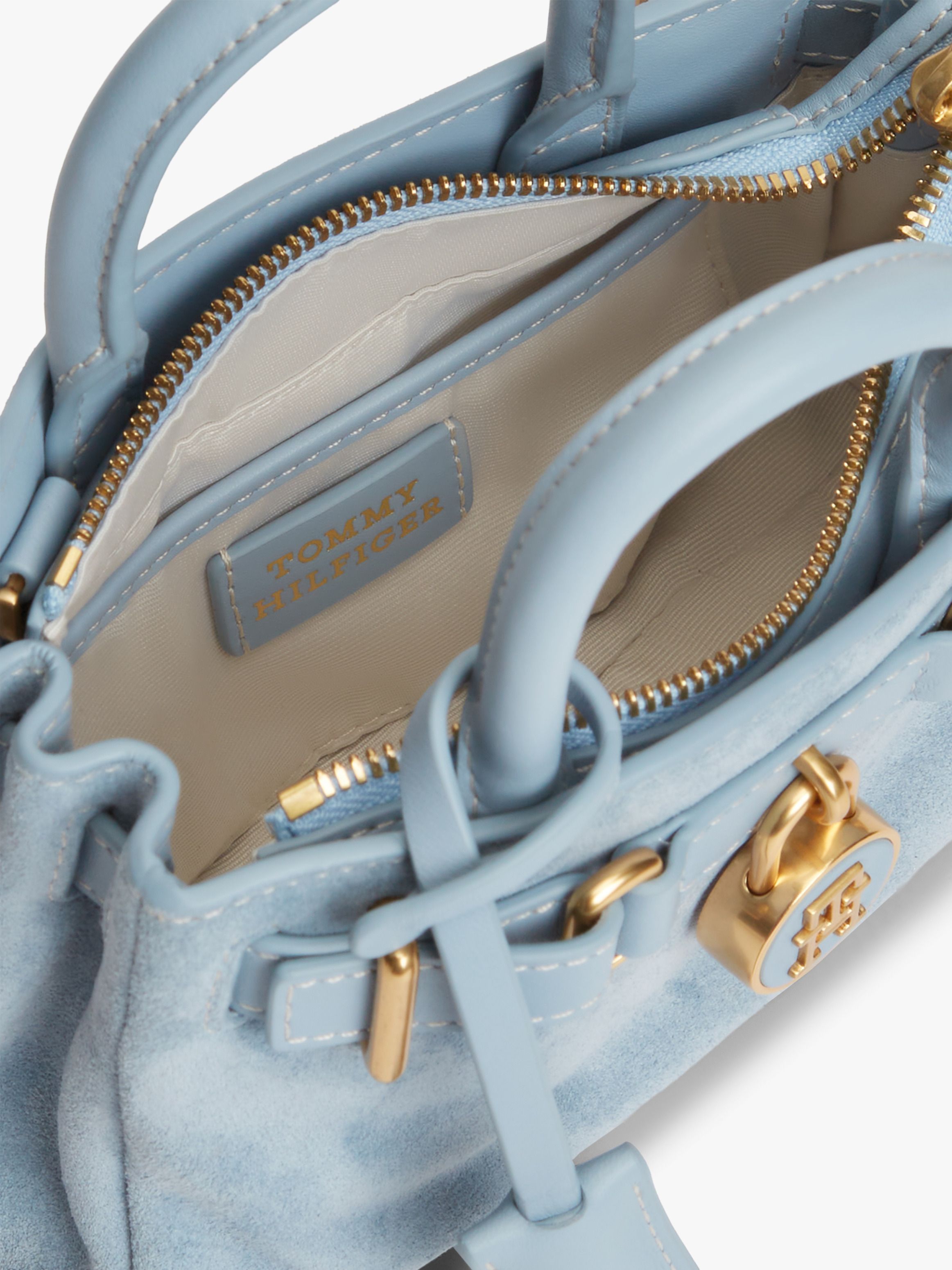 • Suede • Zip closure • Two top handles • Removable crossbody strap • One main compartment • One interior slip pocket • Metal risers on base • Padlock and key detail • TH monogram plaque on padlock • Tommy Hilfiger metal logo on back • Tommy Hilfiger branding