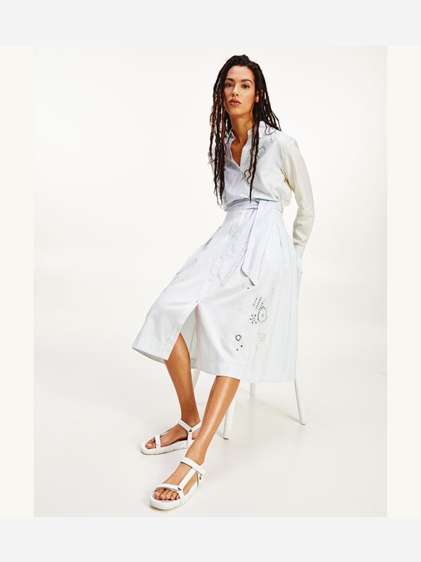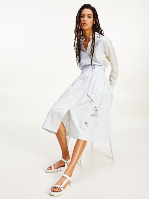 • Pure cotton Oxford • All-over Ithaca stripe • Self-tie belt at waist • Button closure on front • Tonal embroidery on skirt • Tommy Hilfiger branding
