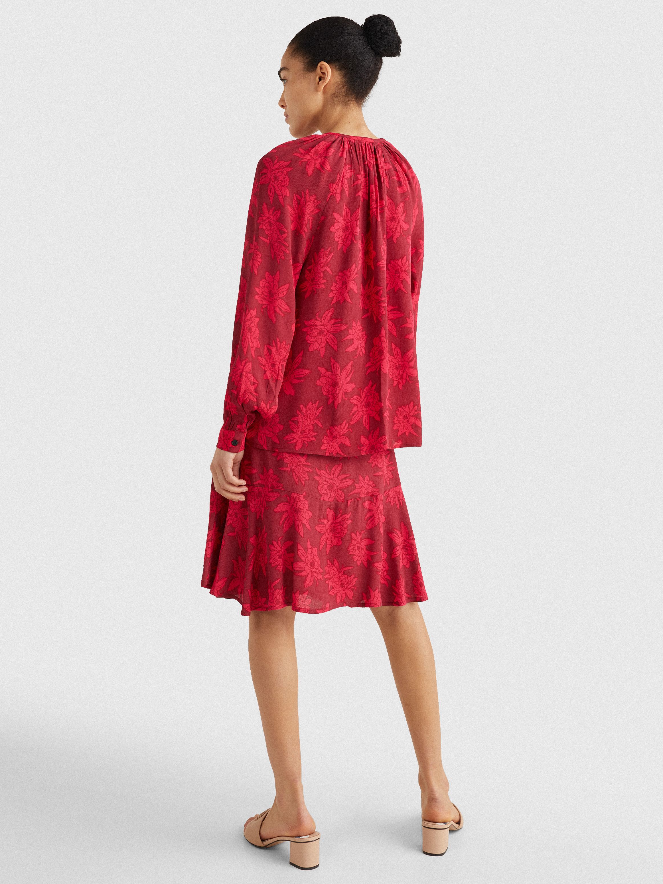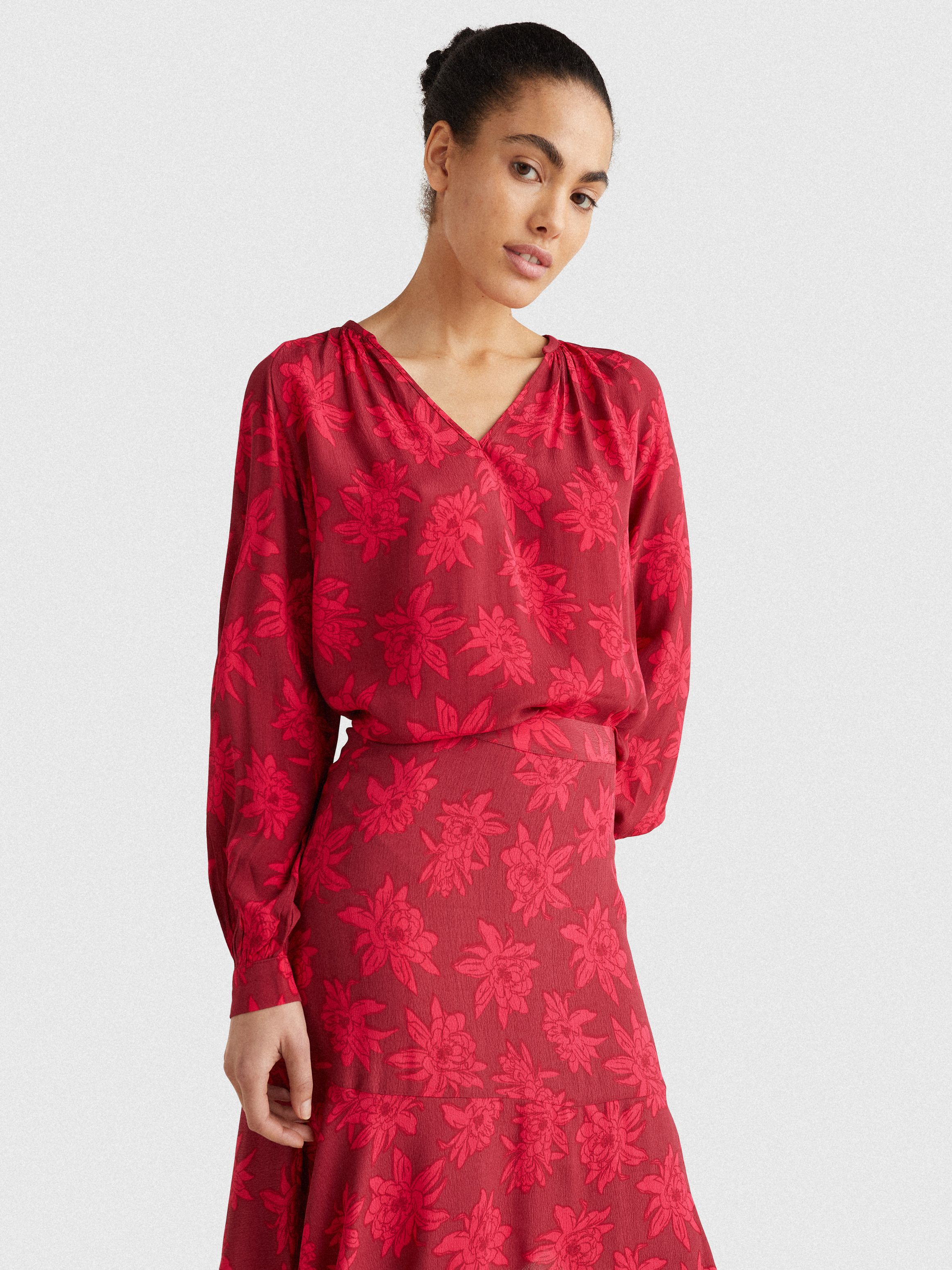 Made of lightweight viscose crepe, this pretty V-neck blouse is decorated with hand-drawn floral prints, ruched shoulder detailing and flowing balloon sleeves.
